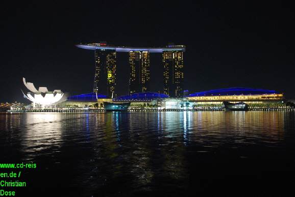 Zum Abendessen fahren wir wieder mit dem Taxi in die City. Zuerst stoppen wir am bisherigen Wahrzeichen des Stadtstaates – dem Merlion, einer Figur aus Fisch und Löwe. Und wir nutzen die Chance und genießen die allabendliche Lichtershow des Marina Bay Hotels, dem neuen Wahrzeichen der Stadt. Das 2010 eröffnete Hotel besteht aus drei Hoteltürmen, die in 200 Metern Höhe mit einem 350 Meter langen Park inkl. Pool verbunden sind. Zum Komplex zählen außerdem Musicaltheater, Shopping-Center und Casino. Die Inhaber betreiben auch Hotels samt Casino in Macao und Las Vegas. Und wir werden morgen ebenfalls eine Nacht verbringen. Juhu!